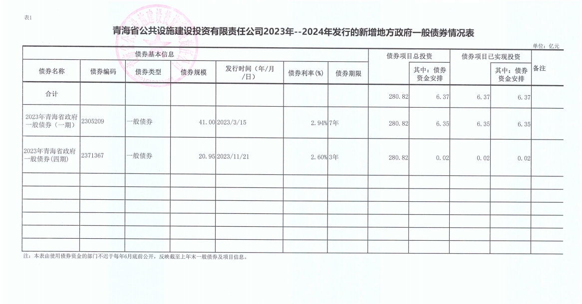 青海省公共設施建設投資有限責任公司2023年--2024年發行的新增地方政府一般債券情況表